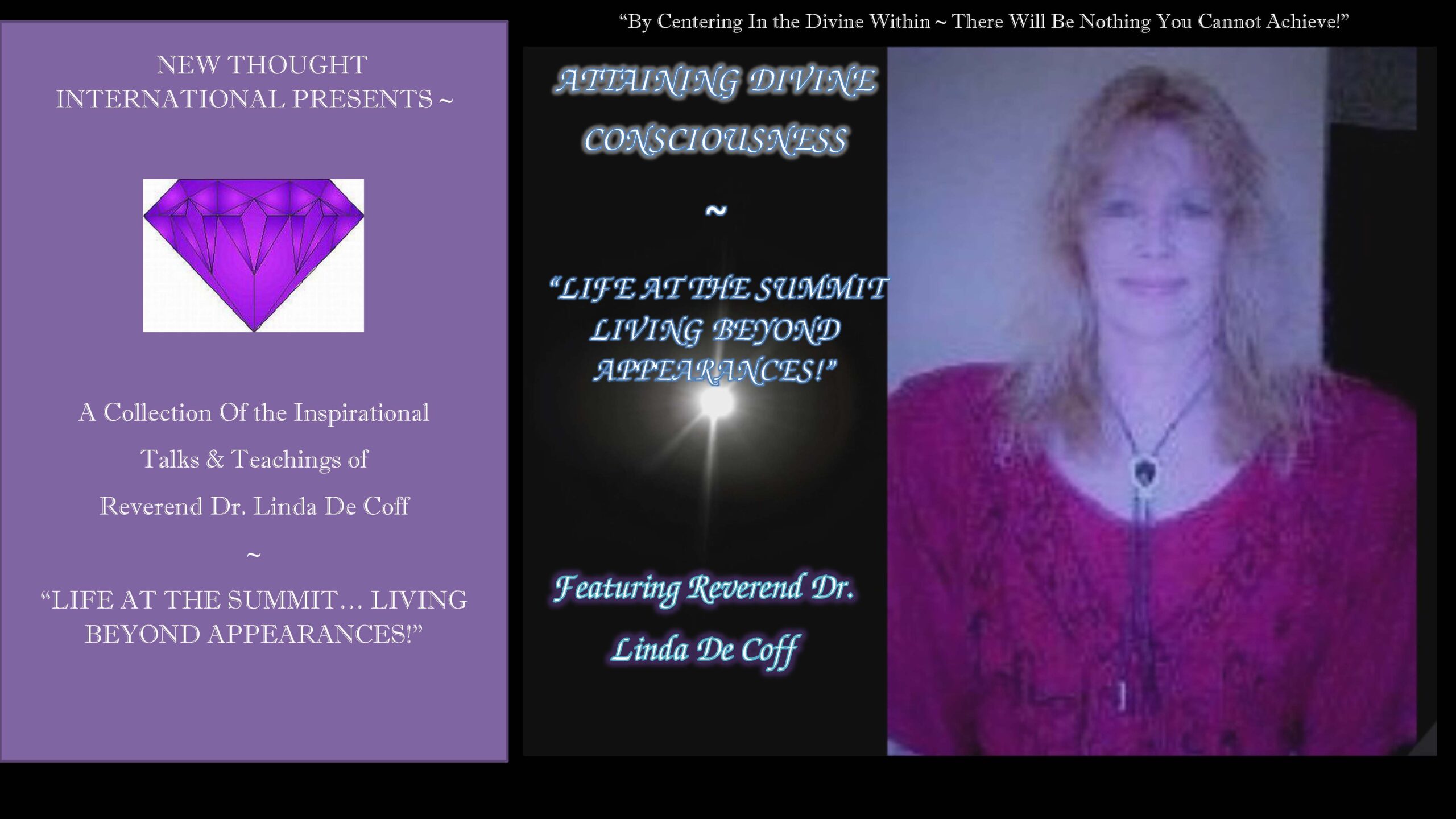 *It is our great pleasure to announce that New Thought International Library is now presenting a complete Inspirational Talk Series from Dr. Linda’s timeless collection of works. For those who truly desire further in-depth information on Higher Consciousness Themes, you will be able to tune in to monthly postings of talks on every subject imaginable throughout this year. Monthly programs will include an extensive talk on the Higher Consciousness Theme being considered, along with accompanying closing meditations , for incorporating deep within. The closing meditations will be available in written form as well, so that you can easily reference in your daily meditations, while working on a particular theme. In this wonderful talk series, you will always find very easy, profound and practical tools for raising your consciousness to the level desired, always illuminating “how to tune in” to the completeness of the Divine-in-you!